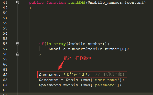 1. 短信发送的内容中出现【啾啾企鹅】或者【好运筹】的问题:找到DXB_sms.php文件中的sendSMS方法,大约在47行左右的位置。在里面第61行左右的位置中,把$content.='【好运筹】';这样的签名换成您自己公司或网站的签名即可。